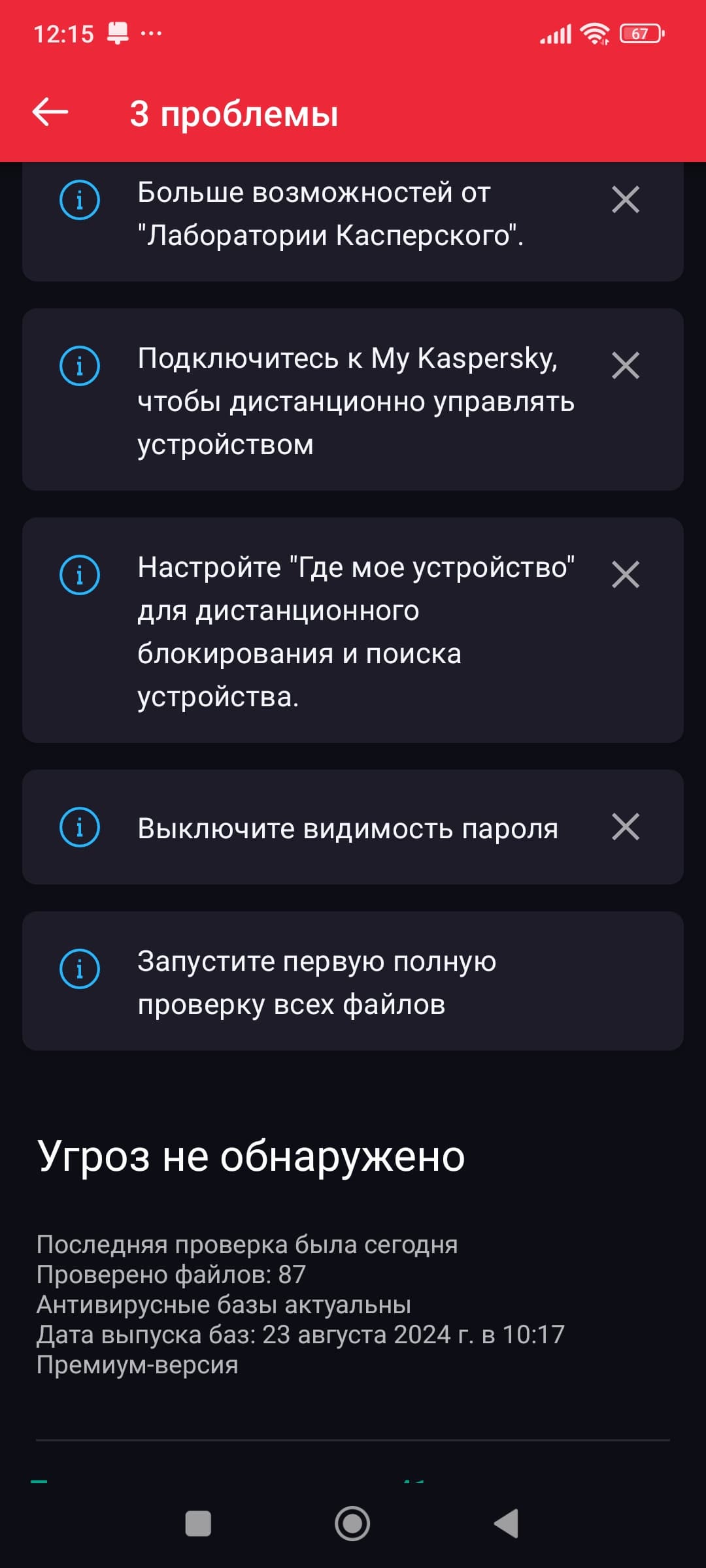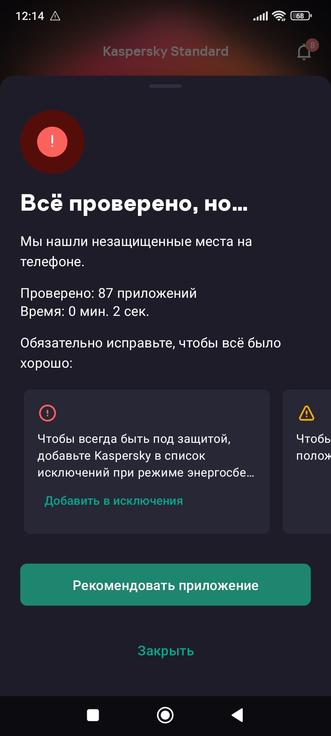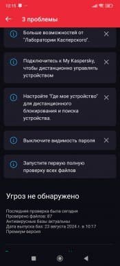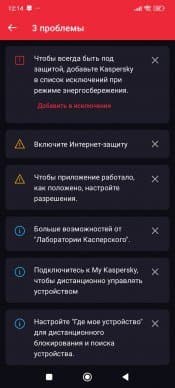 Как известно, плох тот страховой агент, который не найдет, чтобы вам еще нужно застраховать. Kaspersky ведет себя не хуже: после первоначальной проверки приложение обязательно обнаружит проблемы. В нашем случае его установка производилась на «стерильный» смартфон после сброса устройства к заводским настройкам с комплектом лишь тех приложений, которые входит в базовую поставку. Однако и в этом случае Kaspersky обнаружил ряд уязвимостей. Мы выполнили все его инструкции, кроме совершенно избыточных, на наш взгляд.