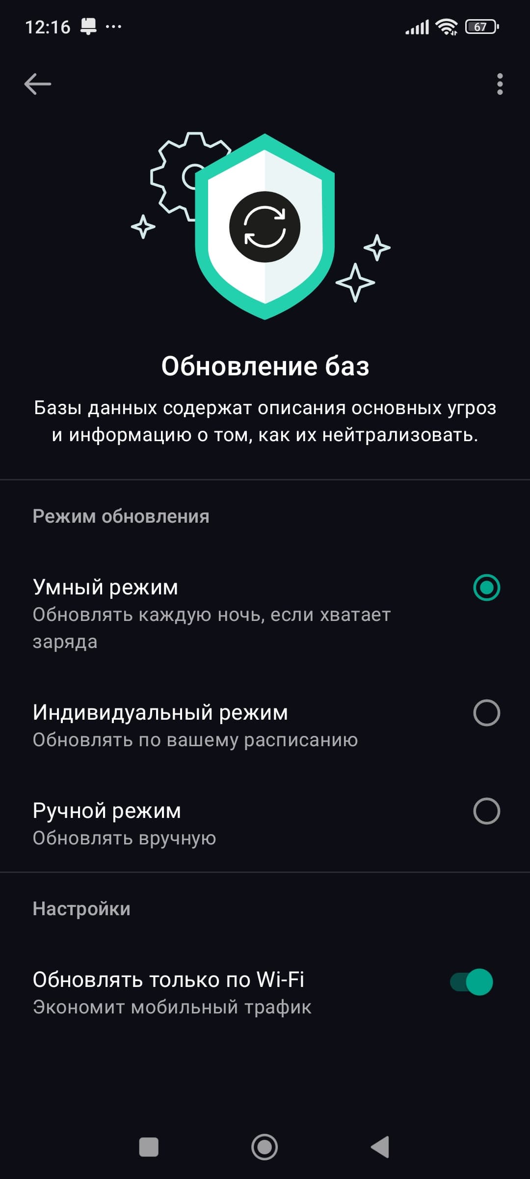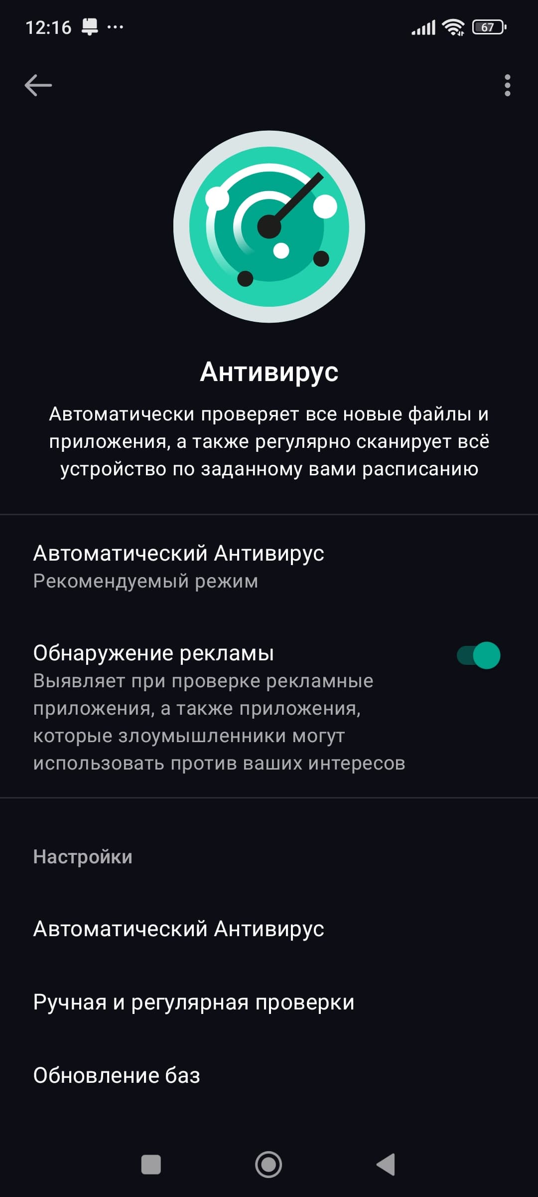 При инициации работы «по ходу дела» можно в подтверждение заявленной функциональности видеть три варианта проверки: быстрая, полная, выборочная. Дополнительно в настройках можно установить подавление рекламы (любой, паразитирующей на устройствах), а также выбрать режим обновления баз сигнатур — «умный», индивидуальный или ручной.