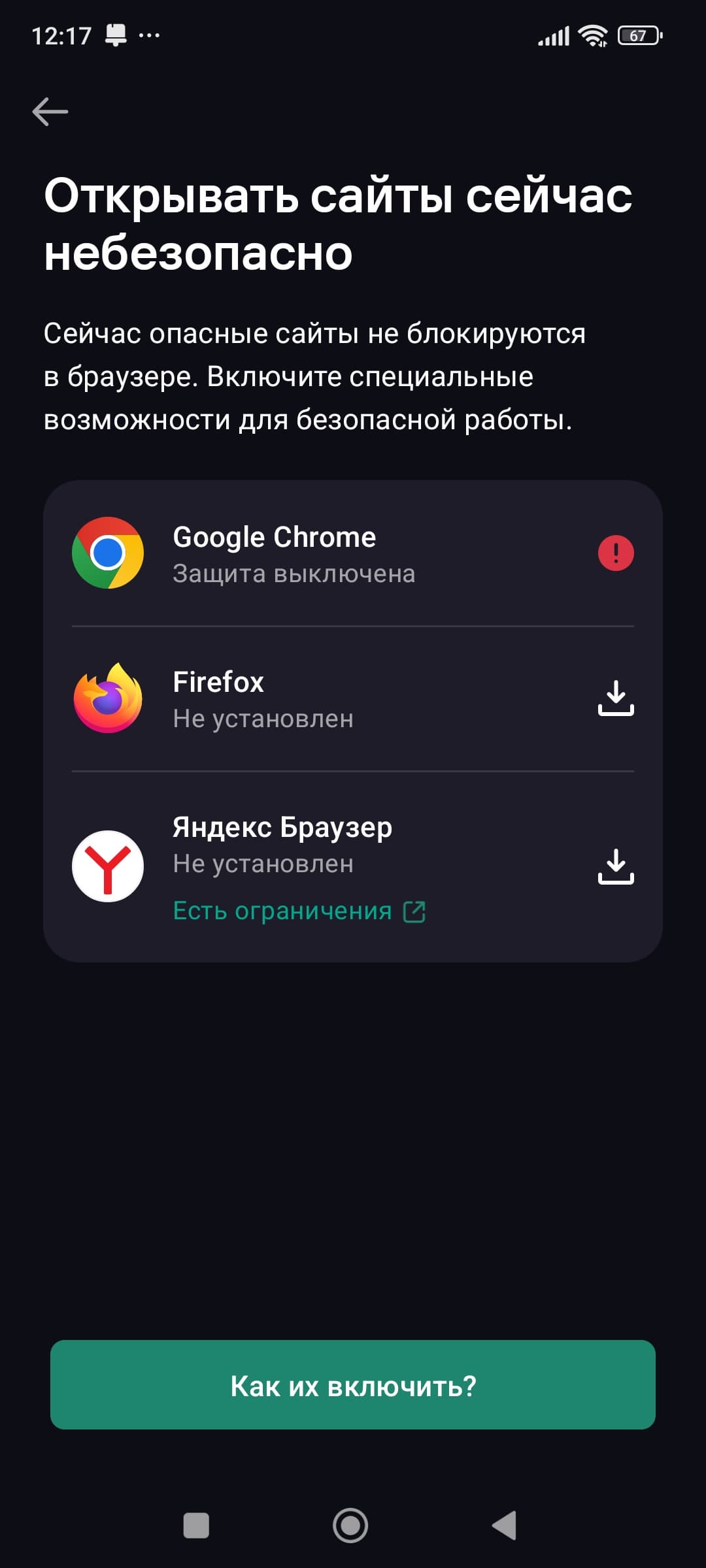 - Защита от фишинга (предупреждения о подозрительных сайтах и сообщениях)