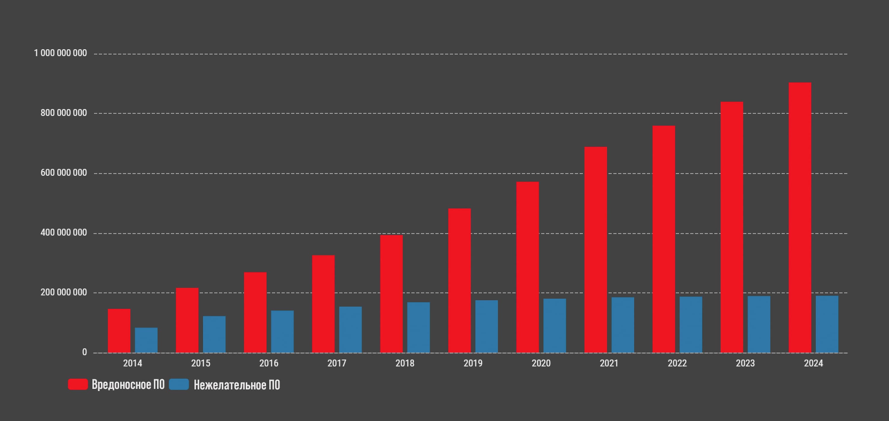 Согласно сайту AV-atlas, объем распространения вредоносного кода вырос за последние 10 лет почти в пять раз, достигнув отметки 0,9 млрд случаев (при этом рассылки просто нежелательных приложений увеличились в два раза и в 2024 г. не добрались даже до 200 млн). Ежегодно появляются миллионы новых вирусов и троянов, что требует постоянного обновления антивирусных баз данных для эффективной защиты пользователей. Еще в 2021 году было зафиксировано более 675 миллионов уникальных URL, на которых происходило срабатывание веб-антивируса, а в конце 2023 г. их количество перевалило за 0,9 млрд.