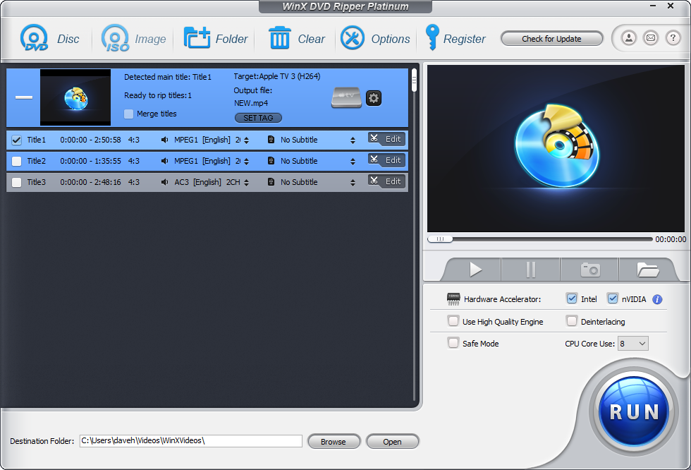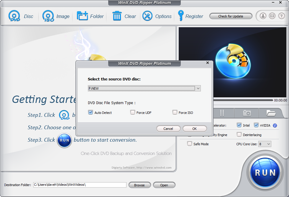 В принципе, без таких детальных настроек можно обойтись — сразу после загрузки DVD нажать кнопку Run, запускающую копирование. Разработчики заявляют об обработке одного DVD всего за 5 минут, но на самом деле таким образом они делают акцент на аппаратном кодировании — скорость же конвертации диска в немалой степени зависит от привода и физического состояния самого диска.