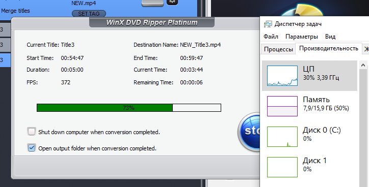 В процессе конвертации WinX DVD Ripper Platinum точно показывает оставшееся время и скорость обработки кадров в FPS. Нагрузка на компьютер при этом очень невелика, особенно при включенных Intel Quick Sync и NVEnc, это позволяет комфортно пользоваться компьютером во время копирования DVD.
