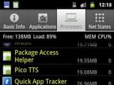 Утилита отображает данные о процессоре, памяти, SD-карте, показывает все запущенные процессы, выводит список установленных приложений и сетевых соединений