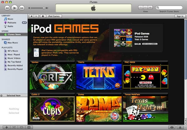 Кроме этого, в iPod-ы пятого поколения теперь можно загружать игры через iTunes Store. Все они, конечно, оптимизированы для Click Wheel. Сейчас в магазине представлено девять игр: Vortex, Tetris, Pac-Man, Cubis 2, Zuma, Texas Hold'em, Mini Golf, Mahjong, Bejeweled. Для российских пользователей это по-прежнему мало актуально.