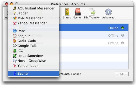 Adium, как показано на скриншоте, поддерживает внушительный список протоколов Instant Messaging: AOL Instant Messenger, Jabber, MSN Messenger, Yahoo! Messenger, .Mac, Bonjour, Gadu-Gadu, Google Talk, ICQ, Lotus Sametime, Novell GroupVise, Yahoo! Japan, Zephyr. Как и положено хорошему клиенту, Adium позволяет одновременно использовать несколько учетных записей.