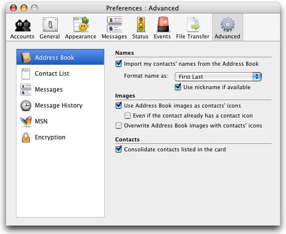 Устанавливаются параметры импорта имен контактов из Address Book (ведь в нем предусмотрено специальное поле для указания в контакте логинов одной из систем: AIM, Jabber, MSN, ICQ, Yahoo), последовательность имени и фамилии.
