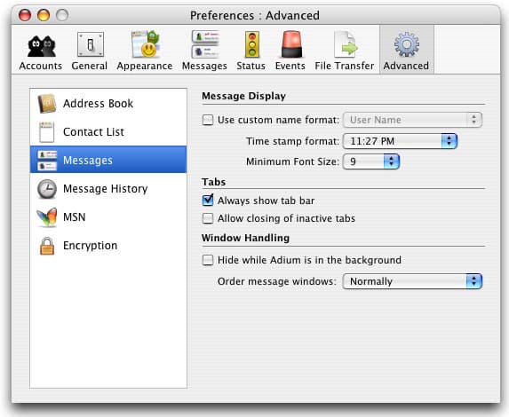 В этом пункте вы можете установить параметры отображаемого имени (реальное имя, ник или вместе), формат временного штампа, минимальный размер шрифта; параметры tab-ов: постоянное отображение tab-панели, закрытие неактивных tab-ов; а также функцию автоматического скрытия окна Adium и установку приоритета по сравнению с окнами других программ.