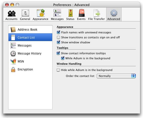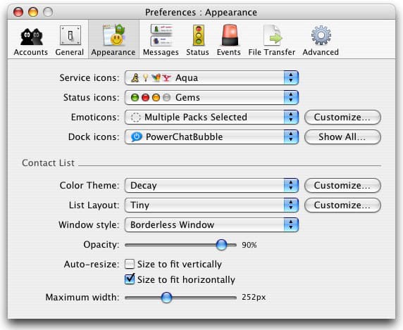 В пункте Appearance устанавливаются сервисные иконки (в комплекте с самой программой идет только один стандартный пакет), статусные иконки (для обозначения текущего состояния пользователя), комплекты смайликов, иконки для Dock-а. Там же настраиваются параметры контакт-листа — вы можете установить цвет, один из трех размеров (плюс отображение картинок пользователей и служб, к которым они подключены), параметры окна (с границами или без, и установить нужную форму), степень прозрачности (!), автоматический ресайз окна по вертикали и горизонтали и максимально допустимую ширину.