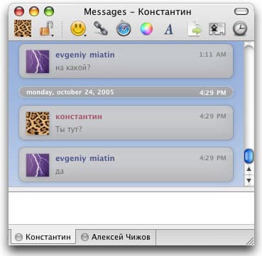 Вот и само окно диалога — в верхней панели расположены значки (слева направо): логотип контакта, шифрование сообщения, вставка смайлика, вставка ссылки, вставка адреса текущей страницы в Safari, настройка цветовой гаммы, шрифтов, передача файла, информация пользователя и архив переговоров.