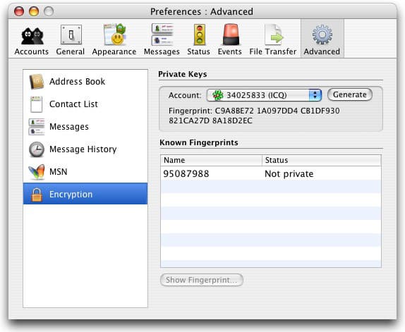 Не так давно в Adium появилась возможность шифрования содержания ваших сообщений. Программа использует алгоритм «Off-the-Record Messaging» (OTR Encryption), более подробно с механизмом его работы вы можете ознакомиться здесь. Разумеется, для ведения зашифрованных переговоров необходимо, чтобы плагин, или соответствующие программы (в нашем случае — Adium), были установлены на обоих компьютерах.