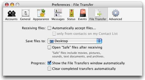 В этом пункте настроек устанавливаются немногочисленные параметры передачи файлов: автоматическое начало передачи (а также полуавтоматическое — только от людей в контакт-листе и вовсе ручное), директория для принятых файлов, автоматическое открытие безопасных файлов (к ним относятся фильмы, изображения, звуки, текстовые документы и архивы), автоматическое открытие окна передачи данных и его же автоматическая очистка.