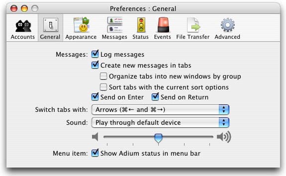 Здесь устанавливаются базовые настройки программы — хранение истории сообщений, клавиши отправки сообщения (Enter и/или Return), относительная громкость звука, наличие иконки Adium в панели меню (рядом с часами).