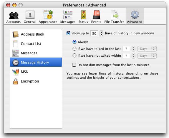 В пункте Message History эта функция активируется, там же устанавливаются дополнительные параметры по отображению истории переговоров в зависимости от времени последнего сообщения.