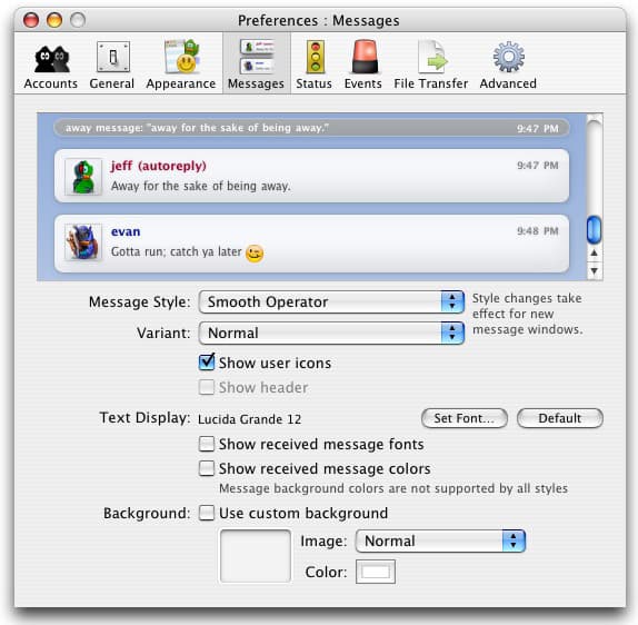Установка всех параметров достаточно проста — любые изменения отображаются в специальном превью-окне. В Adium предустановленны несколько стилей, рекомендовать что-то сложно — у всех разные вкусы, но внимание все же стоит уделить стилю под названием Smooth Operator. В этих же настройках вы можете выставить оптимальный шрифт и выбрать фон (просто цвет или изображение с установленными параметрами выравнивания).