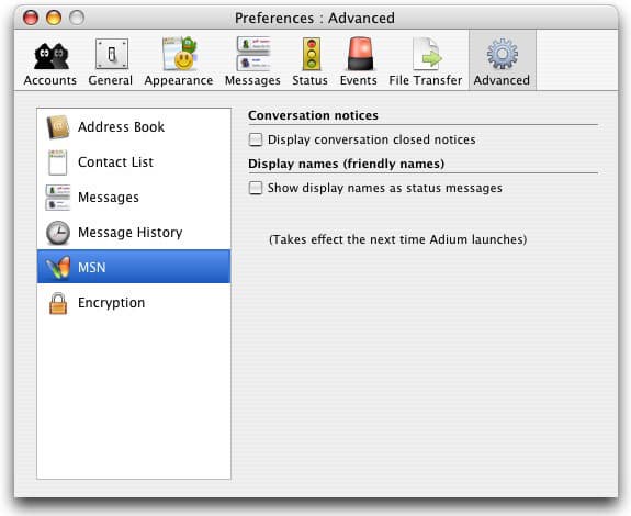 В отдельный пункт вынесены две настройки, актуальные при использовании MSN-подключения: отображение сообщений о закрытии диалога и отображение имен как статусных сообщений.