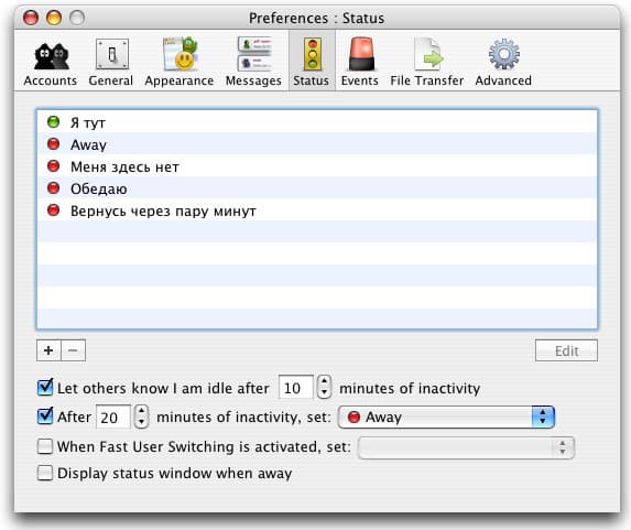 Здесь вы можете добавить дополнительные статусные состояния, кроме стандартных Available и Away, добавить возможность включения режима Invisible (по непонятным причинам его нет в предустановленном списке — придется добавить самостоятельно), а также установить статусные сообщения и возможности автоматического ответа.