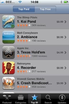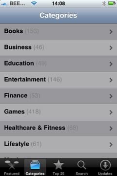 Программы отсортированы по категориям: Books, Business, Education, Entertainment, Finance, Games, Health & Fitness, Lifestyle, Music, Navigation, News, Photography, Productivity, Reference, Social Networking, Sports, Travel, Utilities, Weather. Присутствуют привычные для iTunes Store рейтинги наиболее популярных программ (причем, есть рейтинг наиболее популярных платных и бесплатных программ).