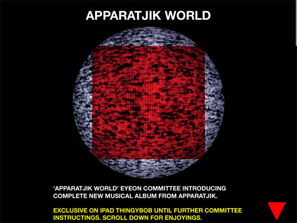 Музыканты продолжают осваивать возможности iPad и App Store. Вслед за Бьорк свою интерактивную вселенную решила создать супер-группа Apparatjik (в коллектив входят Гай Бэрримэн из Coldplay, клавишник и гитарист Магне Фурухолмен из A-Ha, вокалист и гитарист Йонас Бьерре из Mew и продюсер Мартин Терефе). Причем, в отличие от исландской певицы, Apparatjik выпустили плод своего креатива бесплатно, но — только для iPad.