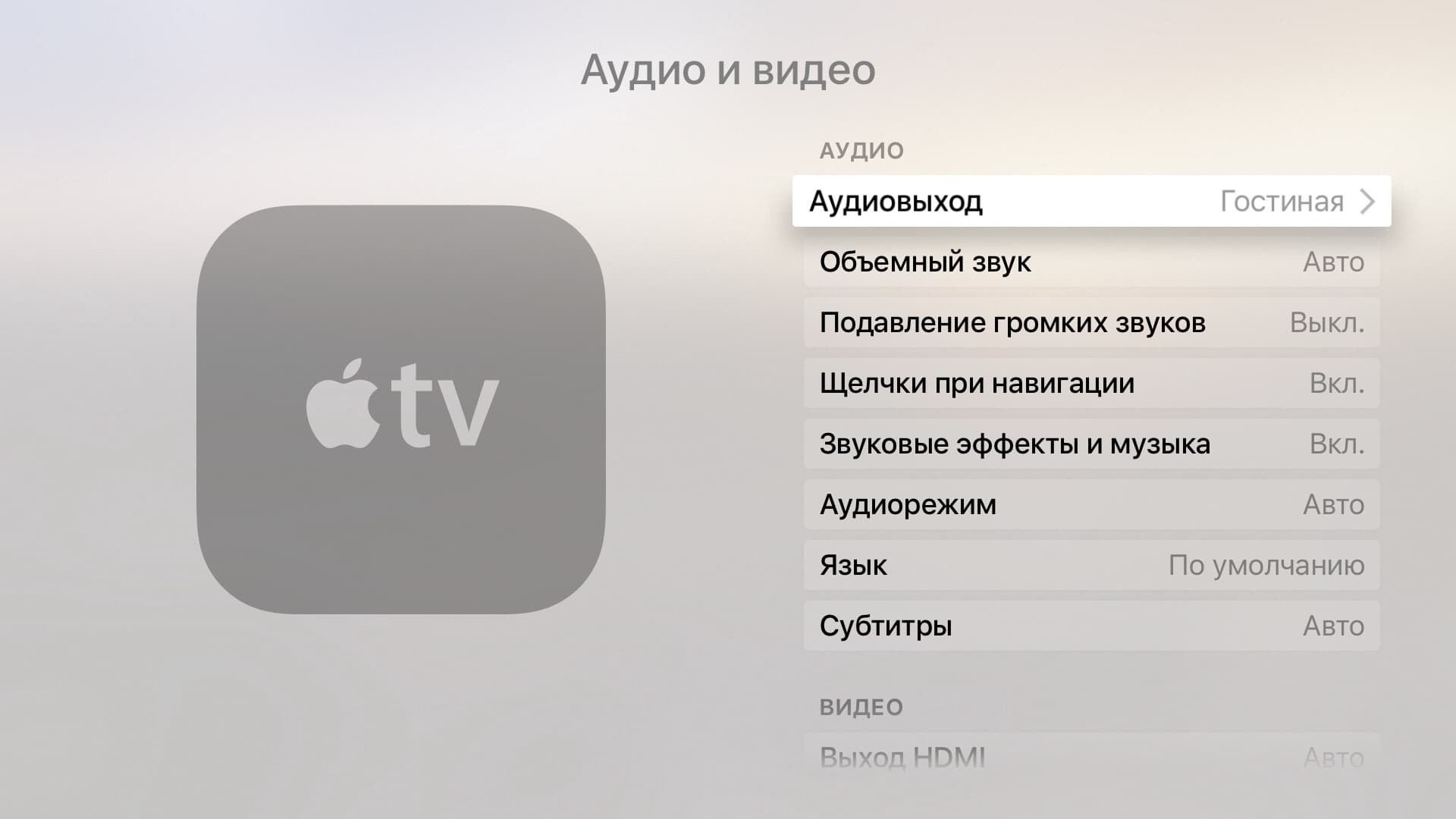 Настройки звуковой системы включают в себя выбор аудиовыхода (напомним, что допускается работа и по Bluetooth, а также трансляция на другие приемники по AirPlay), режима многоканального звука, включение звуковых эффектов и щелчков. Здесь же указывается язык звуковой дорожки и субтитров. К сожалению, подобно разобраться в реализации работы с многоканальным звуком в данном случае не представляется возможным. Впрочем, большинству потенциальных пользователей эта информация не нужна. Отметим только, что во время тестов на трейлерах наш ресивер писал о приеме многоканального PCM-звука, так что вероятно распаковка цифровых дорожек происходит в самой приставке и вывести оригинальную дорожку DD не получится.