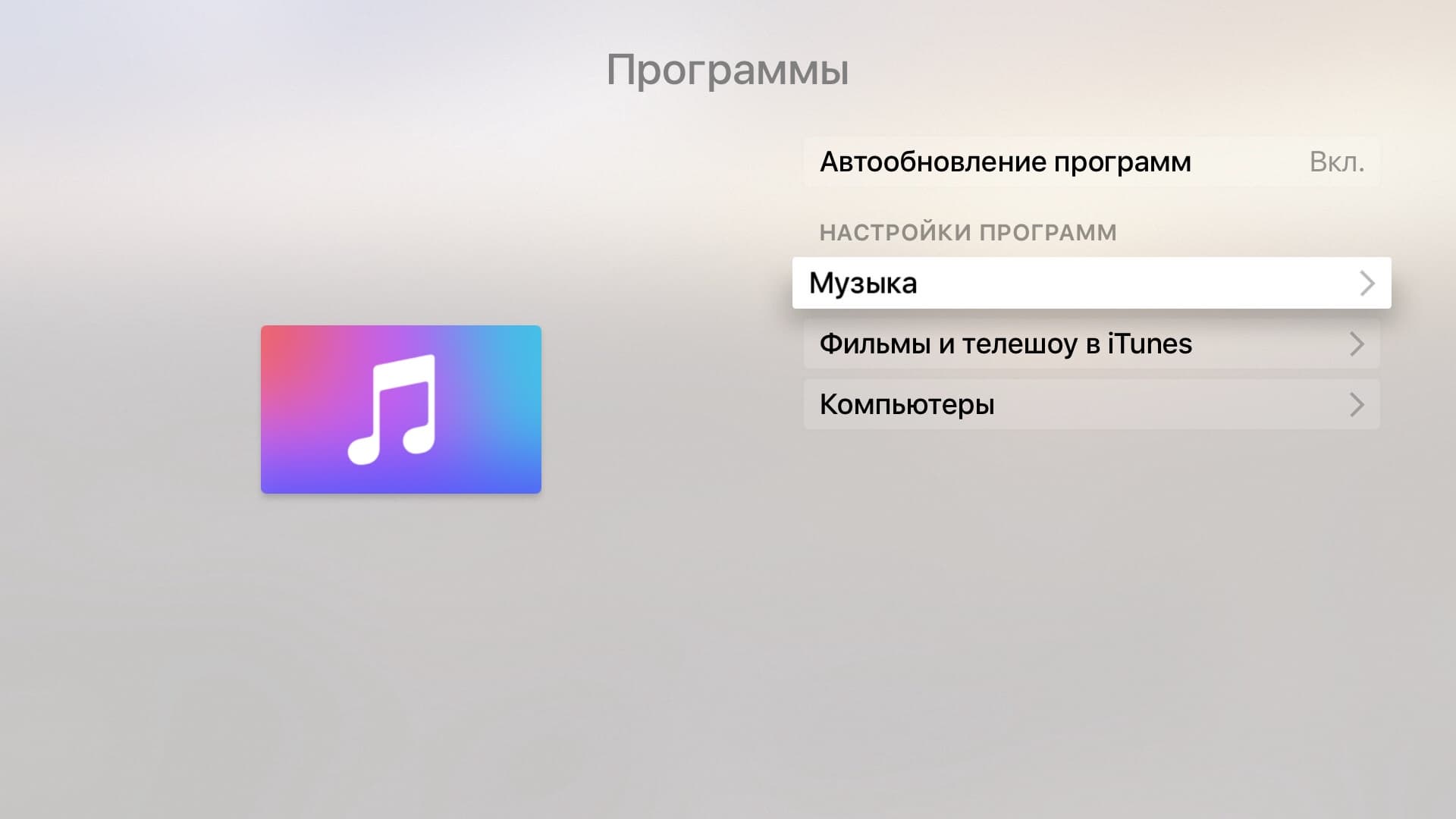 В разделе «Программы» есть пункт включения автоматического обновления программ, а также некоторые индивидуальные настройки. В частности, для базовых программ «Музыка», «Фильмы и телешоу в iTunes» и «Компьютеры» можно выбрать режим повтора при воспроизведении, формат видео и фильтр плейлистов.