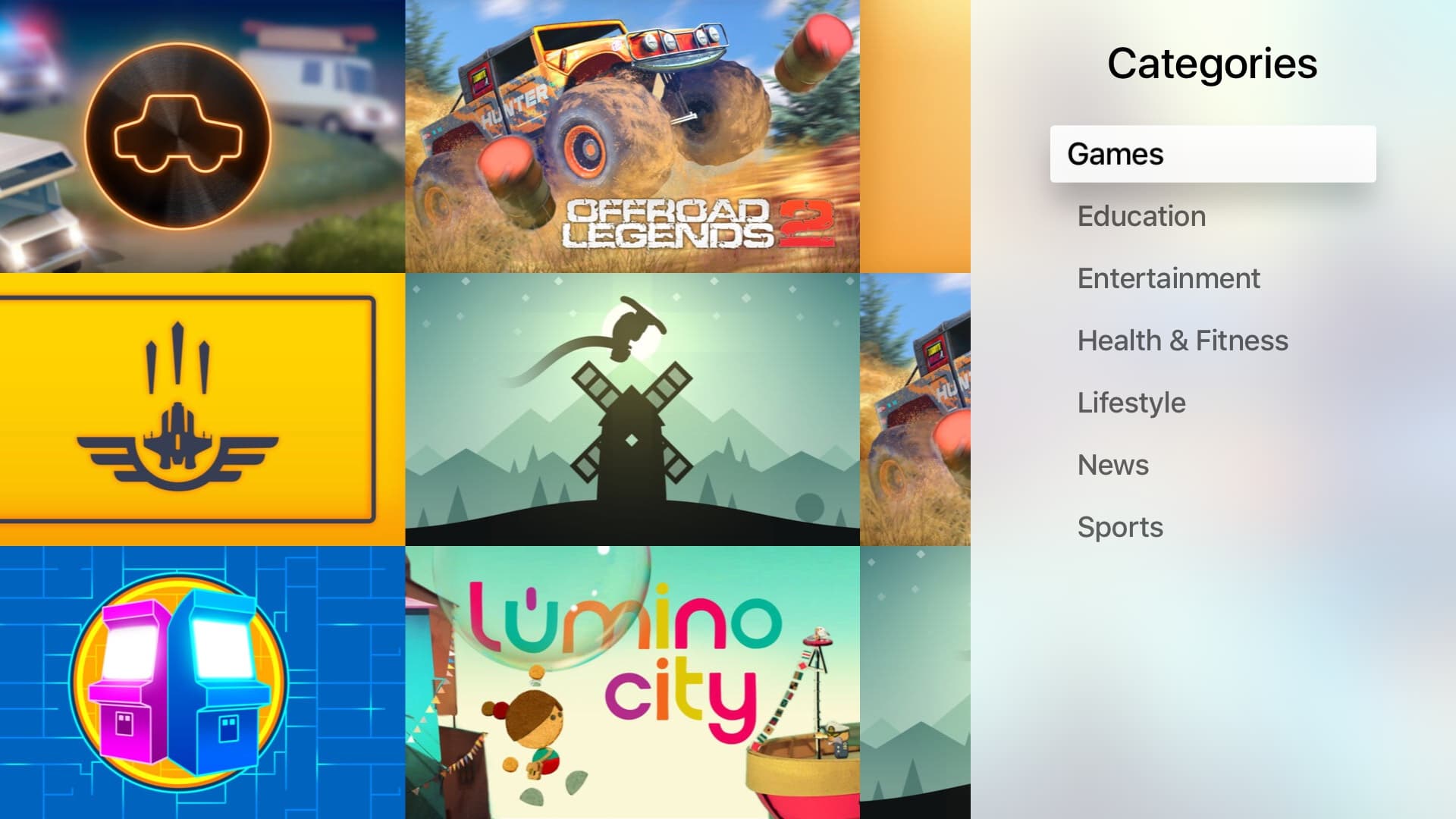 Каталог имеет привычный дизайн со списками наиболее популярных приложений, категориями, разделом купленных программ и поиском. Основных категорий семь — Games, Education, Entertainment, Health & Fitness, Lifestyle, News, Sports. Однако в разделе купленных программ присутствуют также Music, Photo & Video и Utilities. Похоже, что система автоматически предлагает вам уже используемые на других устройствах программы, если есть их версия для Apple TV.