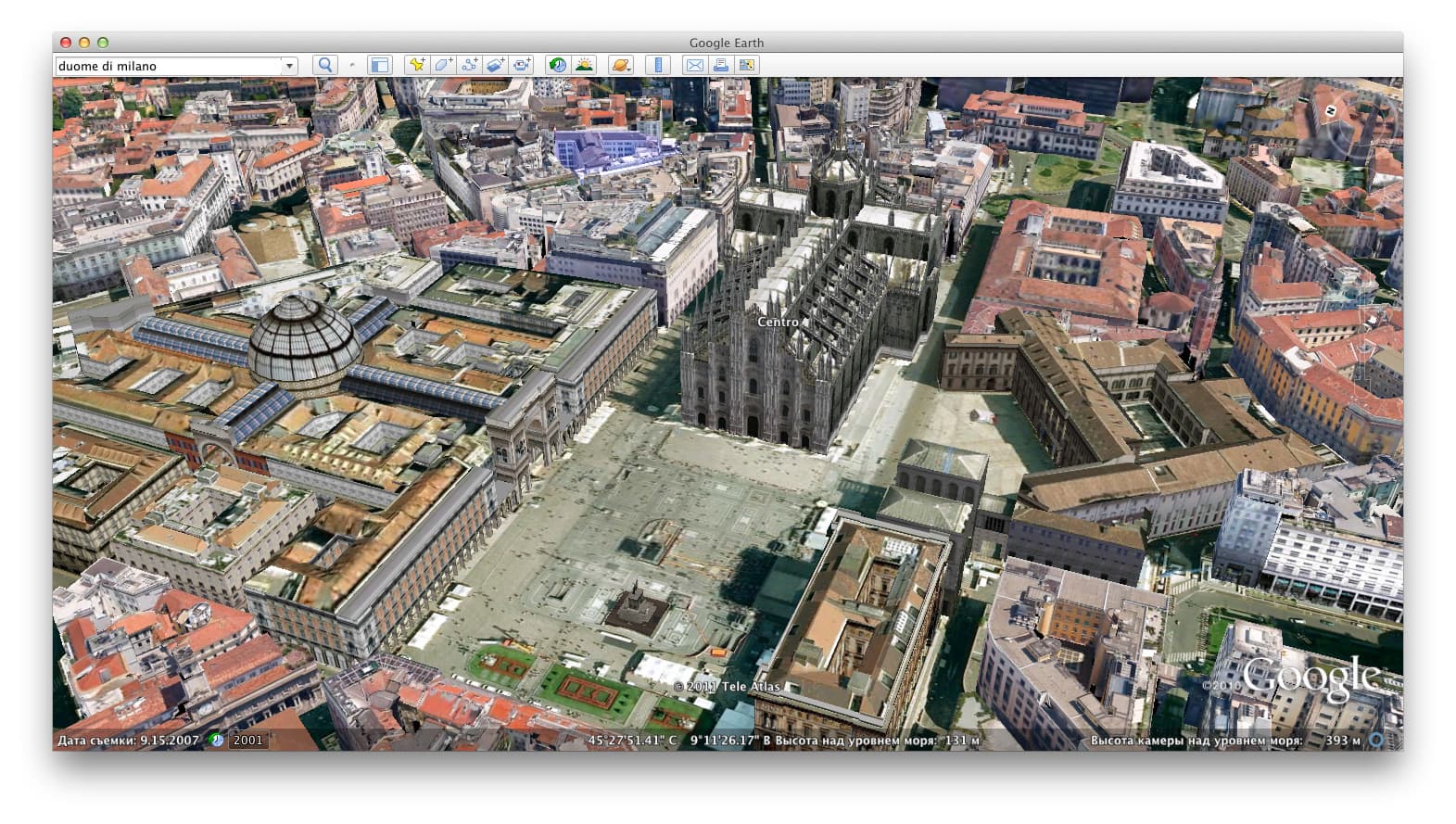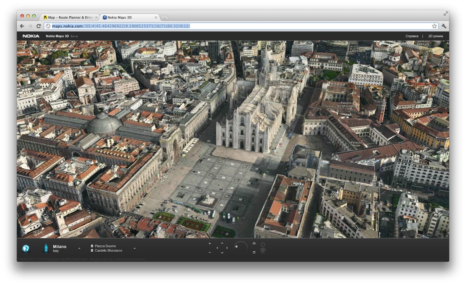 Трёхмерные модели миланской соборной площади, выполненные в Google Earth (верхний скриншот) и сервисе Nokia Maps, использующем одну из ранних версий технологии С3 (нажмите на картинку для просмотра изображений большего размера):