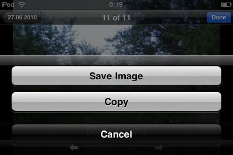 Теперь посмотрим приложение Gallery для iPhone. Оно сделано по образцу стандартного приложения Photos, которое есть в каждом iPhone / iPod touch. Фотографии можно увеличивать-уменьшать двумя пальцами, пролистывать привычным жестом, в общем — все, к чему мы привыкли в Photos. Кроме того, можно послать по почте ссылку на любую фотографию (жаль, что нельзя послать саму фотографию прикрепленным файлом), а также экспортировать фото в Photos (для этого надо открыть фотографию, удерживать палец на экране, после чего нажать Save Image).