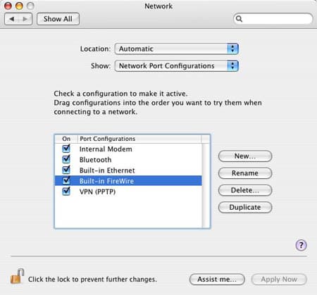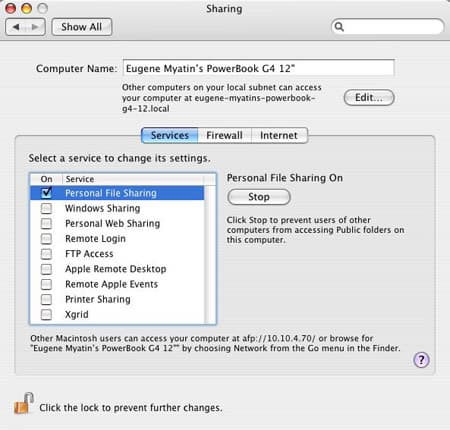 Самый простой способ объединить 2 компьютера Macintosh с Mac OS X Tiger с целью обмена файлами — использовать FireWire-кабель. Достаточно подсоединить кабель, на двух компьютерах в System Preferences выбрать Network -> Network Port Configurations и включить пункт Built-in-FireWire и в меню Sharing включить пункт Personal File Sharing.
