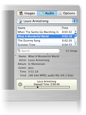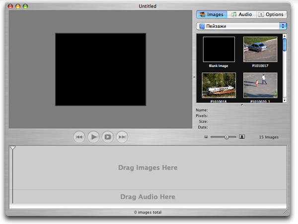 То же самое касается и музыкального оформления слайд-шоу: если нажать на кнопку Audio, можно выбрать любую композицию из библиотеки iTunes и прослушать ее с помощью мини-плеера. Перетащив мышкой нужный трек в область плейлиста, получаем звуковую дорожку нашего проекта.