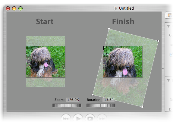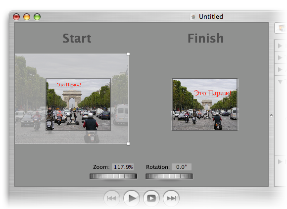 Каждое состояние изображения имеет настройки масштаба и поворота, которые можно регулировать как с помощью мыши, так и инструментами Zoom и Rotation, которые находятся под рабочей областью. Во время воспроизведения слайд-шоу, текущий кадр будет постепенно переходить из «левого» положение в «правое». Приложив немного фантазии, с помощью Pan&Zoom можно создавать эффекты скроллинга, вращения и масштабирования, которые помогут расставить акценты на нужных деталях фотографий или просто добавить слайд-шоу динамики. С помощью инструмента Motion производится тонкая настройка скорости «превращения» изображения.