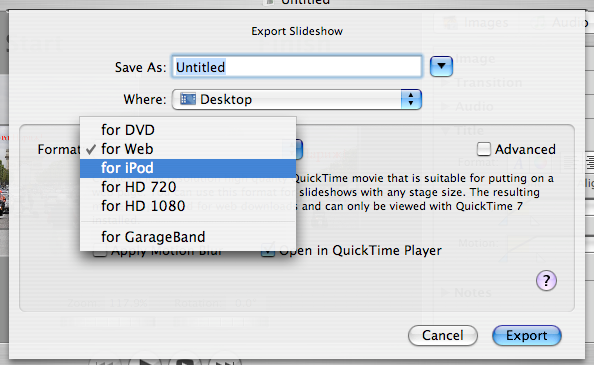 Программа позволяет получить видеоролики для DVD, плеера iPod, публикации в Интернет, форматов 720p и 1080p буквально несколькими нажатиями кнопки мыши. В окне экспорта выводится подробная информация об используемых в каждом случае кодеках и формате (размерах) изображения.