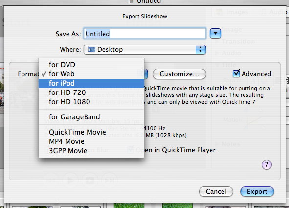 Те пользователи, которые захотят создать «нестандартные» ролики, могут, включив чекбокс Advanced, получить доступ к полным настройкам экспорта средствами QuickTime и выбрать необходимые кодеки, их параметры, а также фильтры. Таким образом, можно создать, например, видеоролик в формате 3GPP, пригодный для воспроизведения на большинстве современных мобильных телефонов.