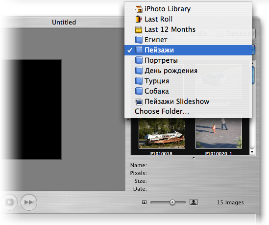 FotoMagico имеет прекрасную интеграцию с iTunes и iPhoto. Порой, создается впечатление, что эта программа наравне с ними входит в пакет iLife. Нажав на кнопку Photos, в браузере можно увидеть все пользовательские фотоальбомы, созданные в iPhoto, что превращает выбор нужных снимков в довольно несложное занятие. Для того чтобы поместить их в проект, нужно просто перетащить их мышкой в область плей-листа.