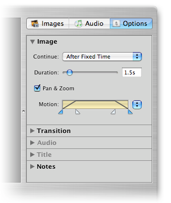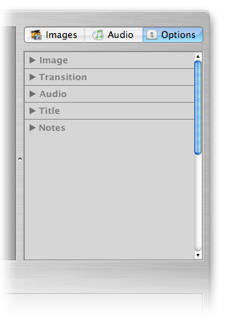 Для того чтобы начать настройку отображения текущего слайда, нужно открыть вкладку браузера Options. В ней расположено несколько раскрывающихся панелей — Image, Transition, Audio, Title и Notes.