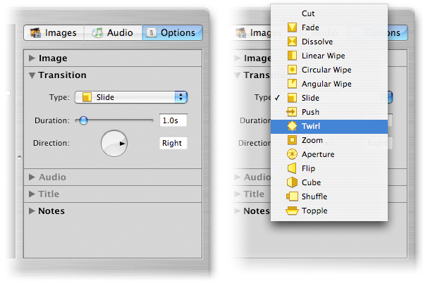 Панель Image отвечает за эффекты, воспроизводимые во время показа слайда, Transition — за переходы между кадрами, Audio — за настройку звукового оформления, Title позволяет настроить подписи к фото, а Notes — добавить к изображениям текстовые заметки.