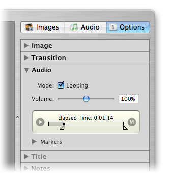 Панель Audio позволяет включить повтор воспроизведения выбранного трека, а также расставить маркеры, которые в сочетании с опцией Continue At Audio Marker из панели Image позволяют задать длительность отображения текущего слайда в зависимости от музыкального сопровождения.