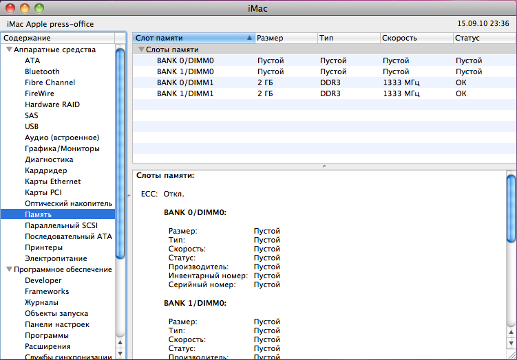 Оперативная память представлена двумя модулями PC3-10700 (DDR3-1333) формата SO-DIMM по 2 ГБ. Несмотря на моноблочный дизайн, у пользователя остается одна лазейка для небольшого апгрейда — увеличение объема оперативной памяти. Два слота уже заняты модулями, а вторая пара свободна. Так что в итоге пользователь может получить 8 или 16 ГБ памяти.