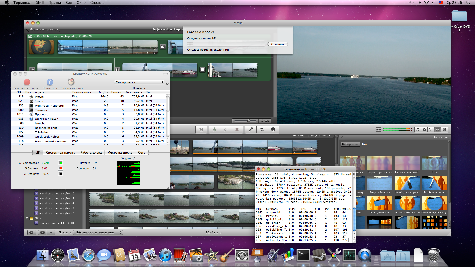 Как вы видите, времени на кодирование HD-видео тратится достаточно много. Несколько исправляет ситуацию удобный интерактивный монтаж в программе iMovie, для которого вполне хватает мощности процессора.