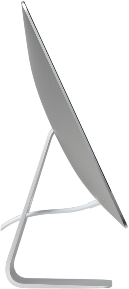 Главная особенность новинки – поразительный, неправдоподобно тонкий корпус. Когда видишь новый iMac, первая реакция: «такого не может быть!». Грани экрана (в едином корпусе с которым находятся и все комплектующие) имеют толщину всего 5 мм. Это меньше, чем у iPhone! Ближе к основанию и ножке корпус утолщается, но это утолщение очень плавное и не сильно больше, чем у предыдущих поколений iMac. В целом получается, что объем корпуса нового iMac примерно на 40% меньше, чем у его предшественника.