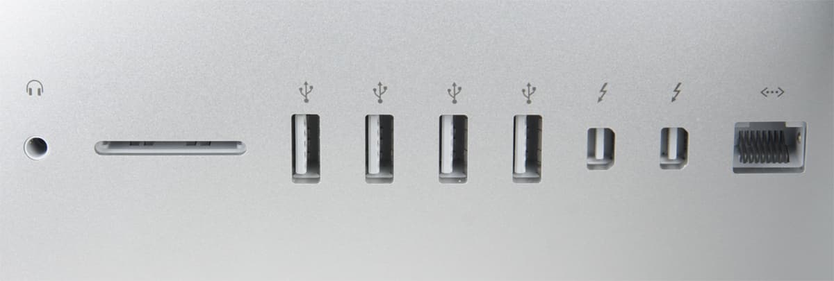 Набор разъемов немного изменился (по сравнению с iMac предыдущего поколения, вышедшего в середине 2011 года). Теперь у iMac отсутствует FireWire и микрофонный вход (джек 3,5 мм), но зато есть второй Thunderbolt и, самое главное, четыре USB 3.0 (в прошлом поколении iMac было четыре USB 2.0). Неизменными остались разъем Ethernet, слот для карт памяти SD/SDXC и выход для наушников 3,5 мм.