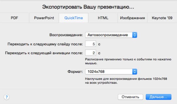 И, наконец, третье: проблемы с объемом файлов у Keynote нет. Файл .pptx, созданный в Keynote, будет весить примерно столько же, сколько и в остальных пакетах. По крайней мере, такой критической разницы, как в случае с документами Pages и Numbers, здесь мы не встретим. Да и собственный формат .key куда более экономен, чем родные форматы Pages и Numbers. Так, использованная нами презентация .pptx в оригинале «весит» 1,7 МБ, а после сохранения в .key — 3,2 МБ. Да, конечно, больше, но все-таки не в 10 раз! Более того, у Keynote есть любопытная возможность сохранения презентации в виде ролика QuickTime (для этого достаточно задать интервал между показом слайдов и указать разрешение видео — вплоть до 1080р). Таким образом, это удобный инструмент для создания слайдшоу.