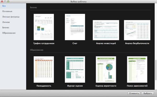Приложение для работы с таблицами Numbers имеет аналогичные Pages проблемы и достоинства. К последним можно отнести наличие большого количества шаблонов — в том числе, для ведения домашнего бюджета, создания журнала посещаемости и прочих полезных вещей.