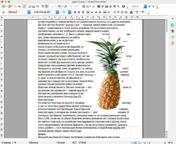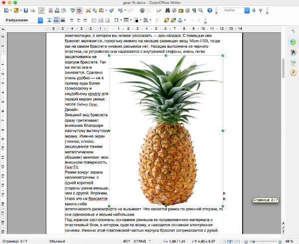 Как видите, сам рисунок и обтекание его текстом остались неизменными. «Но как обстоят дела с другими офисными редакторами?» — возникает логичный вопрос. И здесь мы уже переходим от бочки меда к ложке дегтя — причем немаленькой. Вот что мы увидим в OpenOffice — пожалуй, самом популярном бесплатном офисном пакете для OS X.