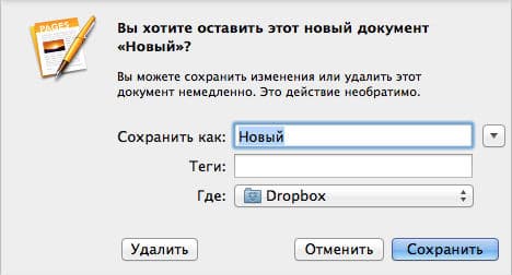 «Почему? Я же уже сохранил файл в .docx!» — подумаете вы. Но программа предлагает нам либо сохранить его же в .pages, либо нажать кнопку Удалить, что чисто эмоционально непросто (сразу закрадываются мысли: а не потеряю ли я свой текст?). Понятно, что Apple пытается всеми силами заставить нас сохранять в .pages, но удобно ли это пользователю?