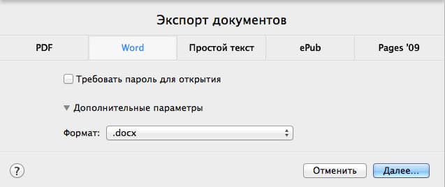 Второй необходимый шаг, пока мешающий полноценно пользоваться Pages — улучшение возможностей сохранения. Сейчас процесс сохранения файла в Pages неудобный, да и результат разочаровывает. Так, для того чтобы сохранить файл в формат .docx, надо проделать следующее. Нажать Файл / Экспортировать в, далее выбрать Word…
