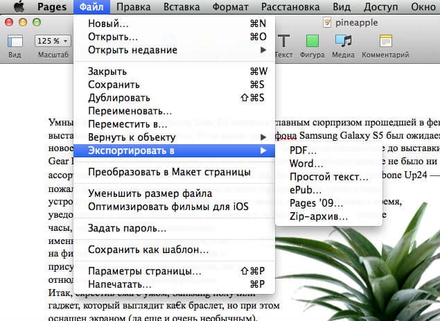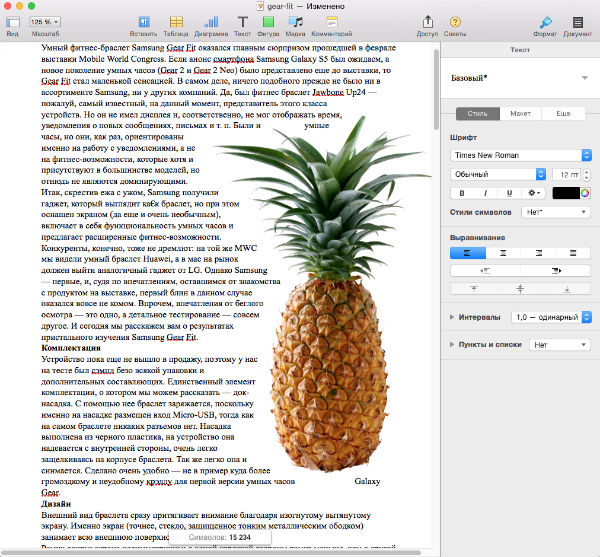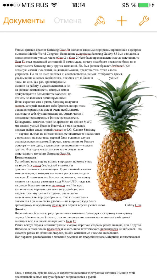 Огромный плюс Pages в отличной совместимости с одноименным iOS-приложением и iCloud. Это значит, что созданный вами на компьютере и сохраненный в .pages документ будет синхронизирован со всеми другими устройствами, привязанными к той же учетной записи iCloud, и его вид на iPad, iPhone или iPod touch будет практически идентичен тому, что вы видели на компьютере. Исключение — шрифты: зачастую Pages на iOS «ругается» на отсутствие нужного шрифта и заменяет его на что-то другое. Ниже — тот же документ с ананасом, открытый в Pages на iPhone.