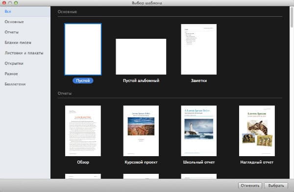 При запуске приложение предлагает нам или открыть файл с компьютера, или создать новый файл, выбрав один из множества шаблонов. Среди этих шаблонов есть даже такие вещи, как, например, объявление с отрывными частями, разные типы резюме и визиток, но нет шаблона пресс-релиза.