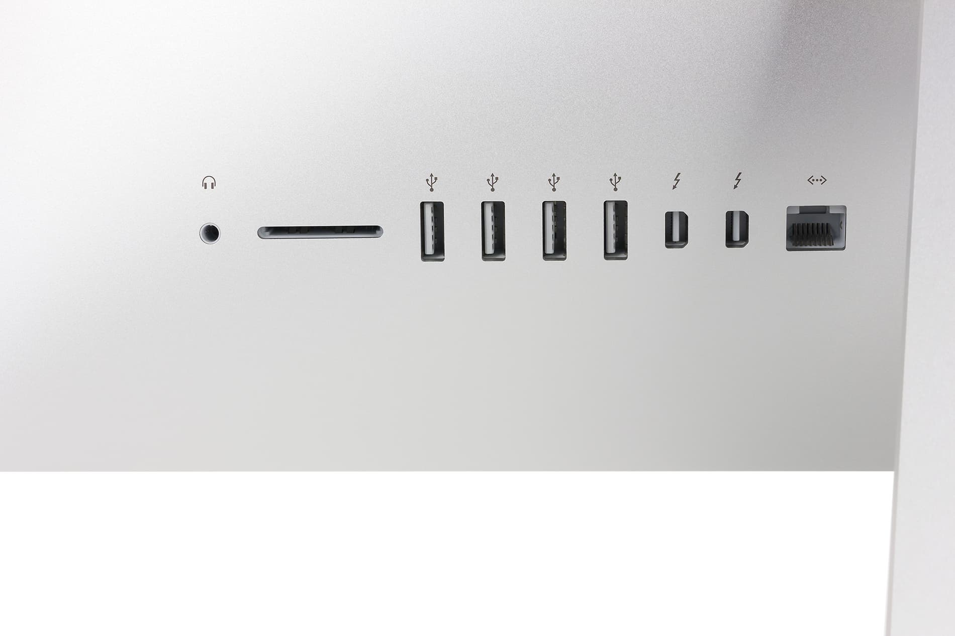 Набор разъемов остался неизменным: 4 порта USB 3.0, 2 порта Thunderbolt, разъем RJ-45 для подключения к сегменту локальной сети, а также слот для карт памяти SD/SDXC и выход для наушников 3,5 мм.