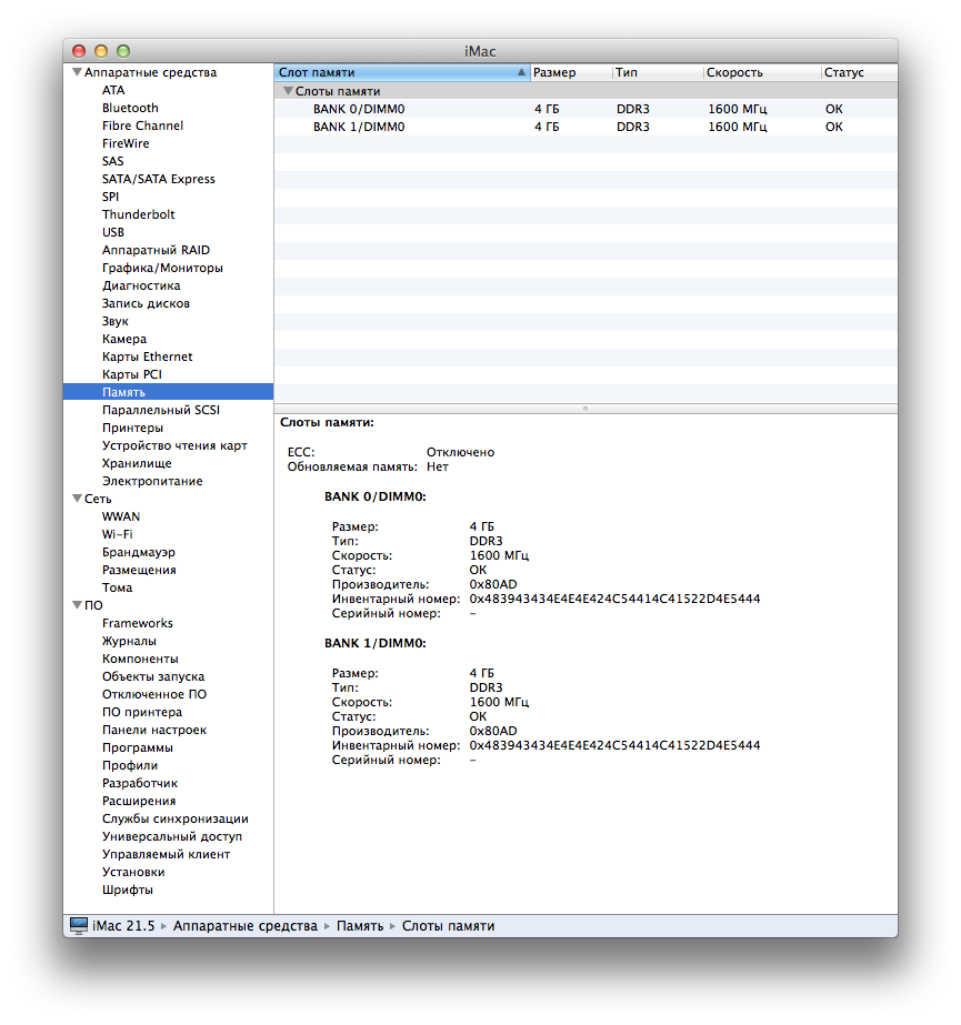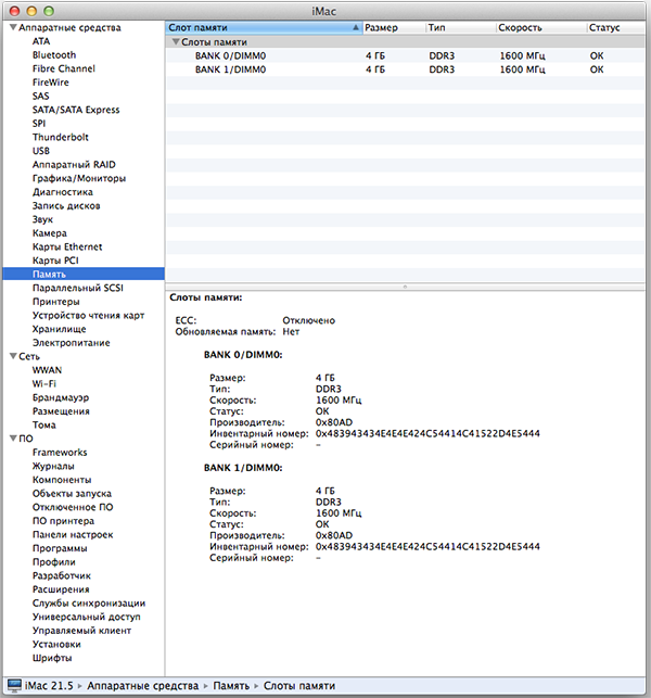 Старшие модели 21,5-дюймового iMac также комплектуются 8 ГБ памяти, однако в них используются два модуля по 4 ГБ памяти DDR3-1600 и опционально возможно увеличение объема памяти до 16 ГБ.