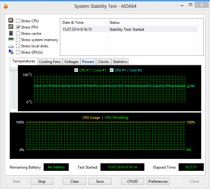 Для стрессовой загрузки процессора использовалась утилита AIDA64 (стресс-тест Stress FPU). Эта утилита позволяет также отслеживать температуру процессора и скорость вращения системного вентилятора.